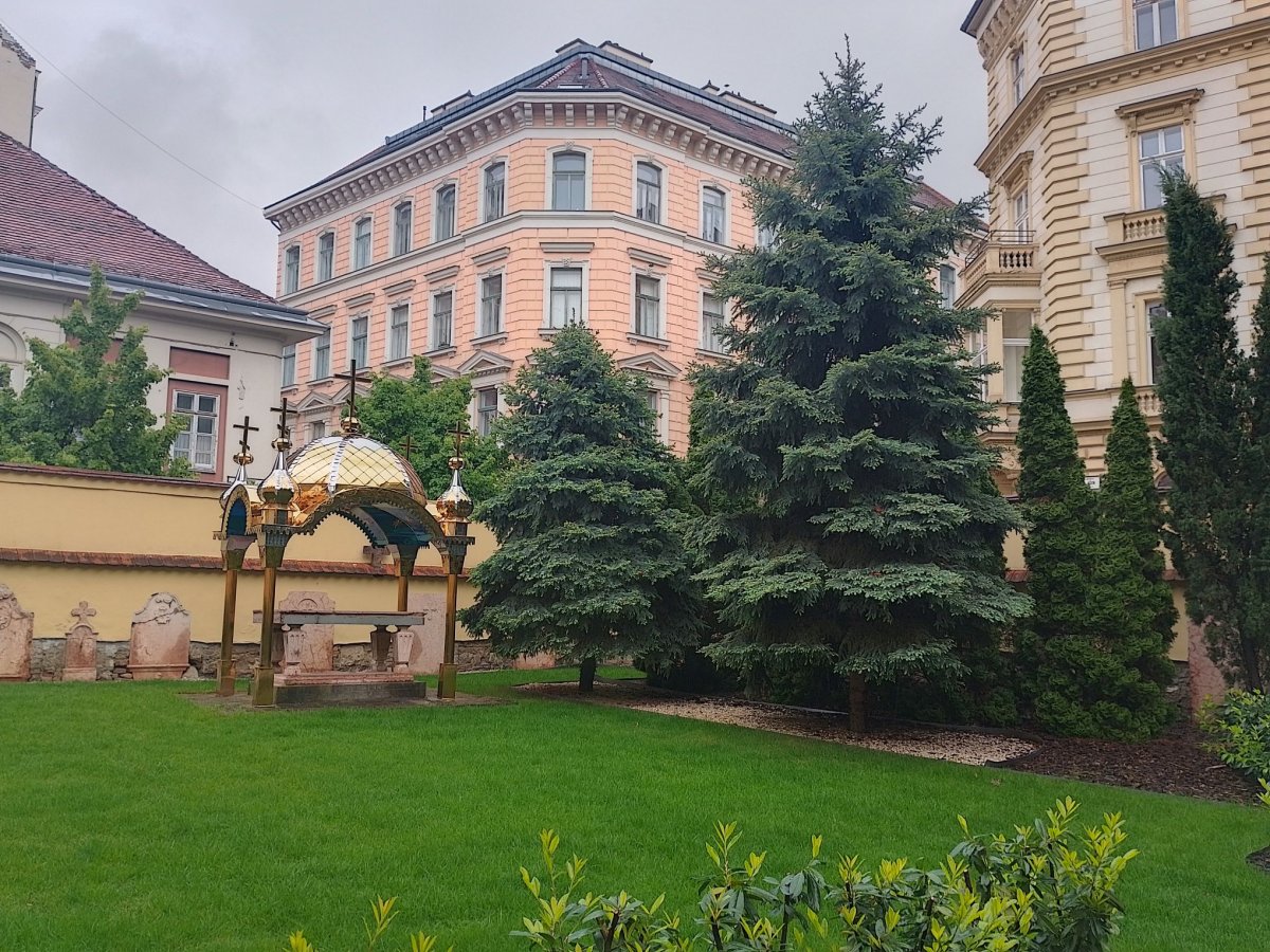 A fal egy hangulatos kis kertet övez, benne lombhullató és örökzöld fákkal, bokrokkal és virágokkal. A Belváros szűk utcái után igazi felfrissülés ez a tágasabb szabad terület, amit a templom liturgiai célokra is használ, az egyik végében ugyanis egy baldachinnal fedett oltárt állítottak fel. A sátorszerű tető az aranyszínű borításával és belső oldalának színes festésével előrevetíti a templomtér gazdagságát is.