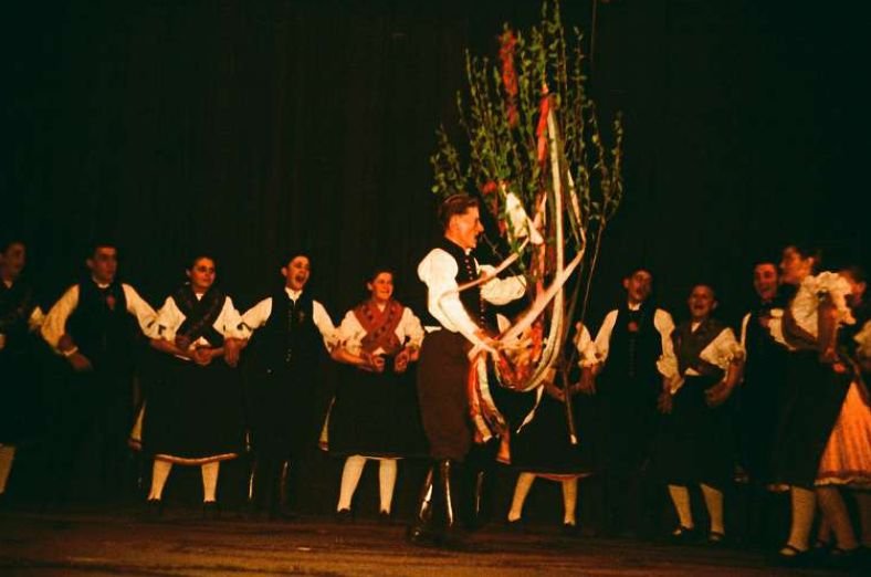 Májusfavitel egy színpadi előadáson (Forrás: Bölcsészettudományi Kutatóközpont, Zenetudományi Intézet)