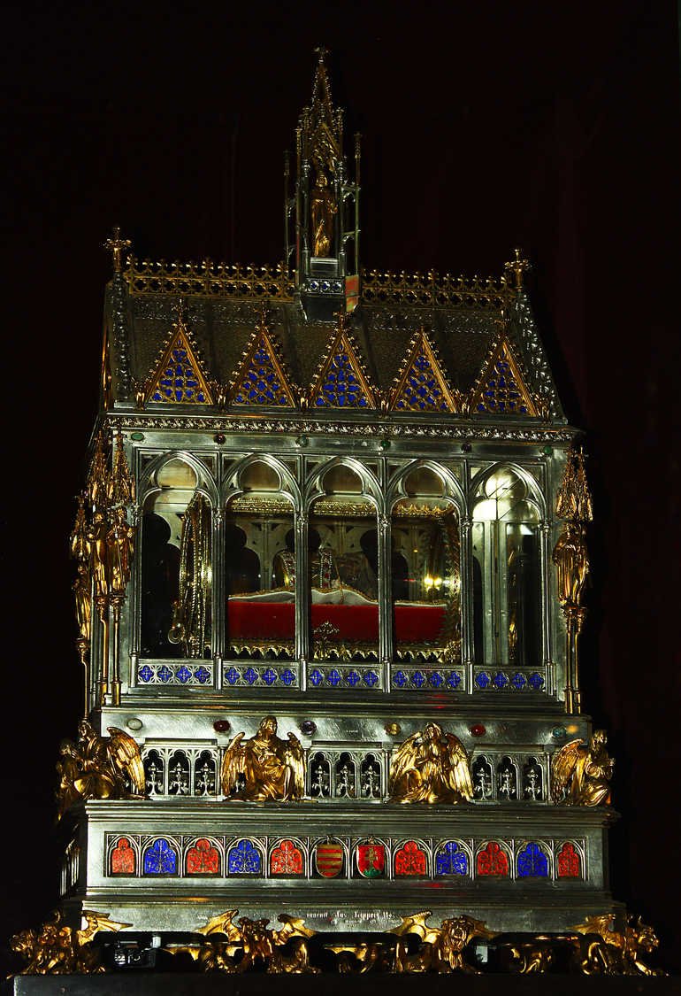 A magyar szentek közül Erzsébet a legismertebb, hiszen élete javát német földön töltötte, arrafelé Türingiai Szent Erzsébetnek nevezik. Halála után Marburgban helyezték örök nyugalomra, és 1235-ben történt szentté avatása után csontjai számára is itt készítették a legdíszesebb ereklyetartót. Egy különleges ereklyéje viszont Esztergomban található, méghozzá az ágyának fejfájából esztergált botot. A tisztelet ugyanis nemcsak földi maradványokat, hanem használati tárgyakat is megillethet. A több mint egy méter hosszú tárgy felső gombját Hessen tartomány címere díszíti, ugyanis II. György hessen-darmstadti gróf készíttette a XVII. század közepén.