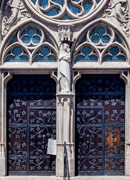 Egy évszázadokkal korábbi épület, a budavári Nagyboldogasszony-templom Mária-kapuját díszíti a következő Madonna-szobor, mely azonban nem is annyira régi. Bár feltehetően a középkorban is állt itt egy hasonló szobor, annak maradványait ugyanis a második világháborút követő ásatások során megtalálták. Így a templom 1960-as években zajlott felújításakor Jálics Ernő megbízást kapott a szobor újrafaragására, munkája pedig 1965-ben került a mai helyére, a kaput kettéosztó és egyúttal a rózsaablakot erősítő támpillér oldalára.