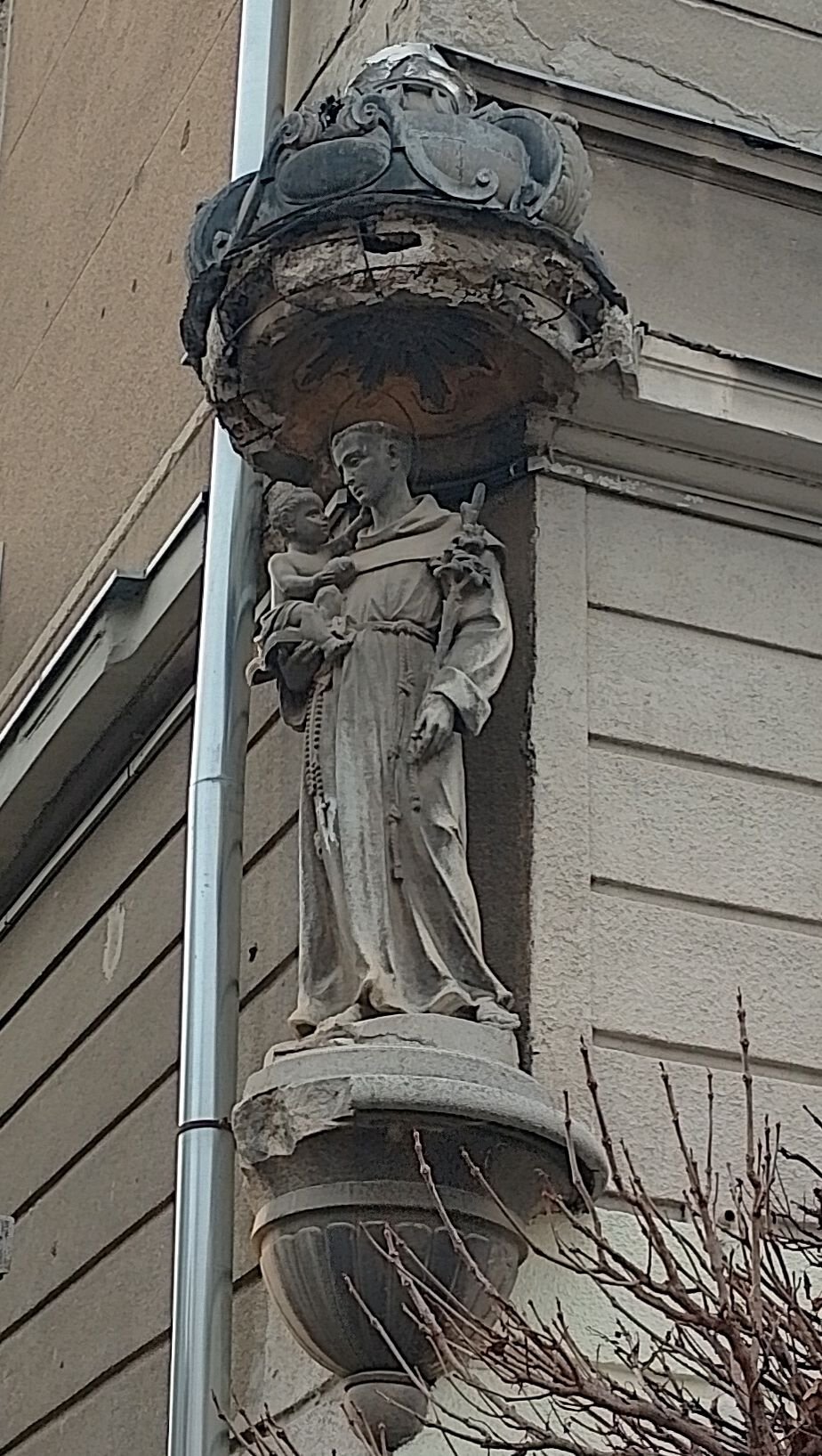 A gyermek Jézust gyakran ábrázolják Páduai Szent Antal karjaiban is annak ellenére, hogy ő csak a XIII. században élt. A ferences vértanú azonban a gyerekek egyik védőszentje, akiket pedig a kis Jézus személyesít meg. Szinte minden katolikus templomban van szobra a bejárat környékén, de felkerült a zuglói Angol utca 44. számú bérházra is, ahol egy sarokkonzolon áll. A Zombory József által 1929-ben tervezett épület egykoron a Zuglói Római Katolikus Egyházközséghez tartozott, ez magyarázza a szakrális témájú szobrot.