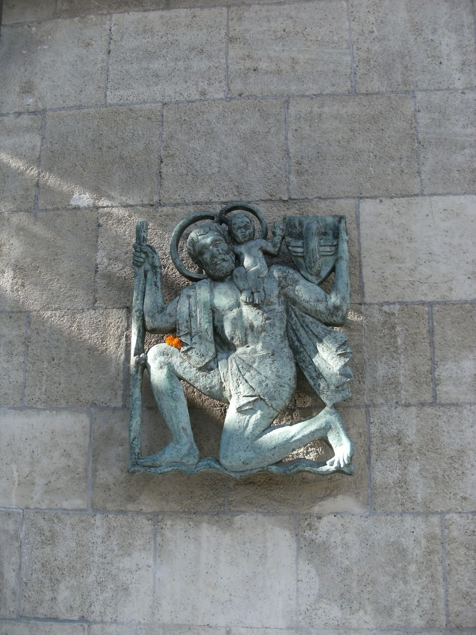Budapesten több köztéri alkotás ábrázolja Szent Kristóf legendáját is, aki hatalmas termetét az emberek segítésére ajánlotta, hogy Krisztus méltó követője legyen: egy veszedelmes folyó mellett telepedett le, és átvitte az arra járókat a túlpartra. Egyszer a gyermek Jézust is felvette vállára és segített neki az átjutásban, innen származik a neve is, mely görögül Krisztus hordozót jelent. Legrégibb fővárosi szobrát, Hűvös László carrarai márványból faragott alkotását 1913-ban állították fel a Városligetben, a Műcsarnok mellett. Az azonban a második világháborúban elpusztult, bronzból öntött másolata – amely mai is látható – 1955-ben került a helyére.