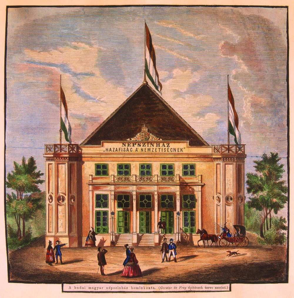 Nyitókép: A Budai Népszínház, ismeretlen mester színezett fametszete Frank József M. litográfiája után (Forrás: SZT KE 5.694 / Színháztörténeti Tár)