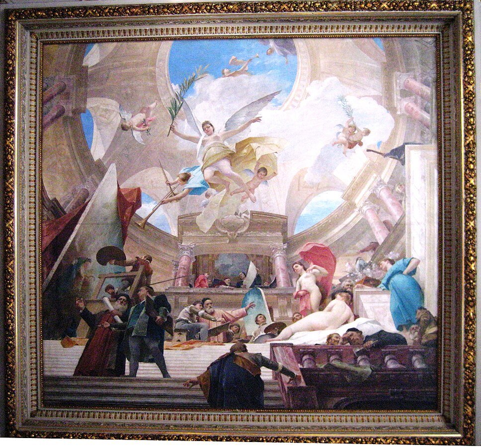 „Az önarckép puszta ténye ebben az impozáns és imponáló környezetben arról tanúskodik, hogy a festő immáron kész elismerni saját jelentőségét és elfoglalni helyét a legnagyobbak között. Munkácsy tehát a Kunsthistorisches Museum mennyezetképén önnön nimbuszát vitte vászonra; ezáltal saját emlékművét teremtette meg. [...] Munkácsy nem csak a művészi (ön)reprezentáció igényével pozícionálta művészi helyét az egyetemes művészettörténet legprominensebb alakjai között, de saját megdicsőülését, „mennybemenetelét” is vizionálta – amely halála után tetőződő kultuszával a magyar kultúra viszonyrendszerében és a máig élő »Munkácsy-mánia« révén meg is valósult.”
