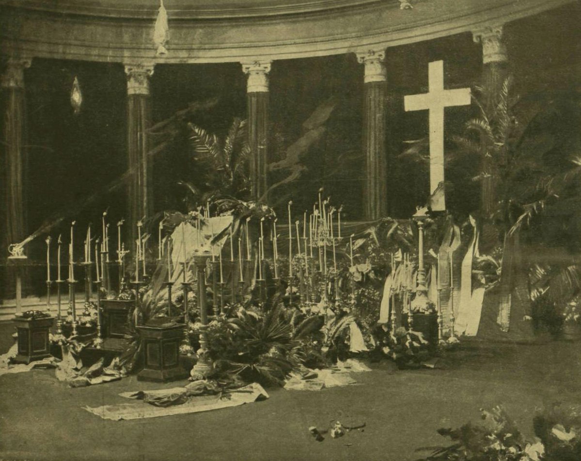 „Hatalmas, fekete posztóval bevont katafalk volt ez, melynek művészileg alkotott gúlaszerű építményén nyugodott Nero császár római szarkofágjának hű másolata, melyet két nap és három éjszaka alatt gipszben mintáztak Strobl mester és segítő társai, akik több mint hatvan órán keresztül csaknem egyfolytában dolgoztak, csakhogy a kellő időre elkészülhessenek. A szarkofág fehér színe megkapó ellentétben volt a katafalk fekete zord külsejével. A szarkofág négy sarkán aranyos edényekben áldozati lángok égtek. Ezek az edények hű másolatai az Attila kincsei néven ismert híres műkincseknek. A katafalk előrészén gyászfátyollal letakarva arany keretben Munkácsy Mihálynak domborművű mellképe volt látható.”