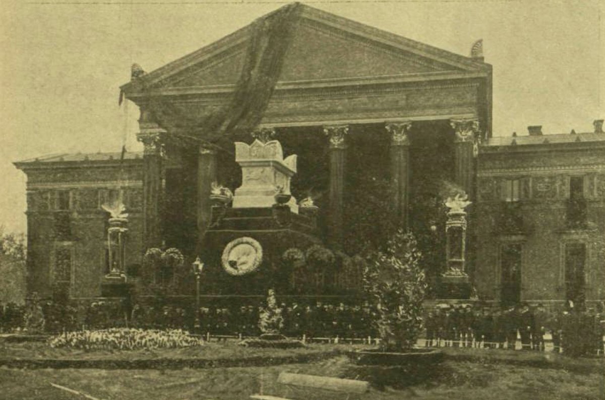 A Képzőművészeti Társulat lapja, a Műcsarnok szemléletes képet ad az alkalmi jellegű, antik mintákat megidéző építészeti alkotásról, a Műcsarnok külső lépcsőzetére állított monumentális építményről: