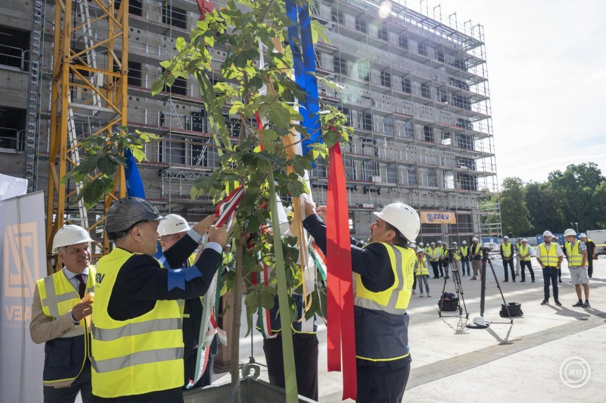 Deli Gergely, a Nemzeti Közszolgálati Egyetem (NKE) rektora és Debreczeni Csaba projektvezető (j-b) szalagot köt a bokrétára az intézmény Ludovika Campuson épülő Katasztrófavédelmi Intézetének bokrétaünnepén (Fotó: MTI/Szigetváry Zsolt)