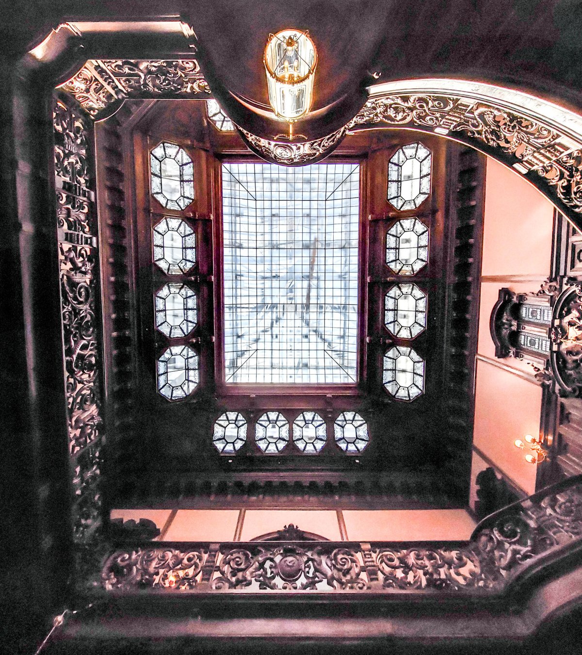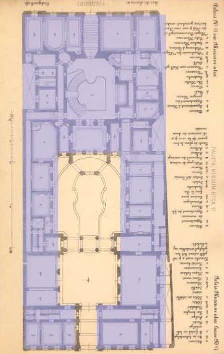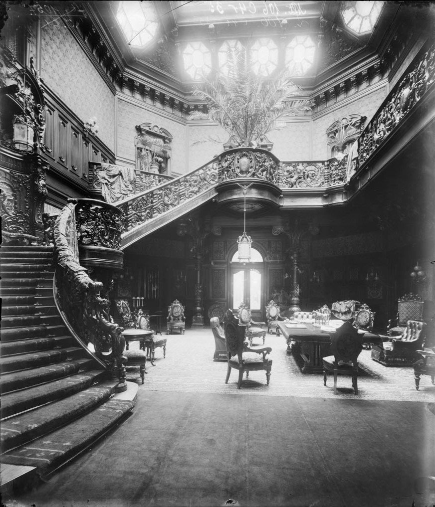 Az épület egyik legkülönlegesebb helyisége a palota két szintjét átfogó hall volt, ahol nappal a művészien kialakított, zöld és fehér táblák alkotta színes üvegezésű tetőablak (felülvilágító), valamint még 16 darab nyolcszögű nyílás biztosította a téregyüttes természetes megvilágítását.