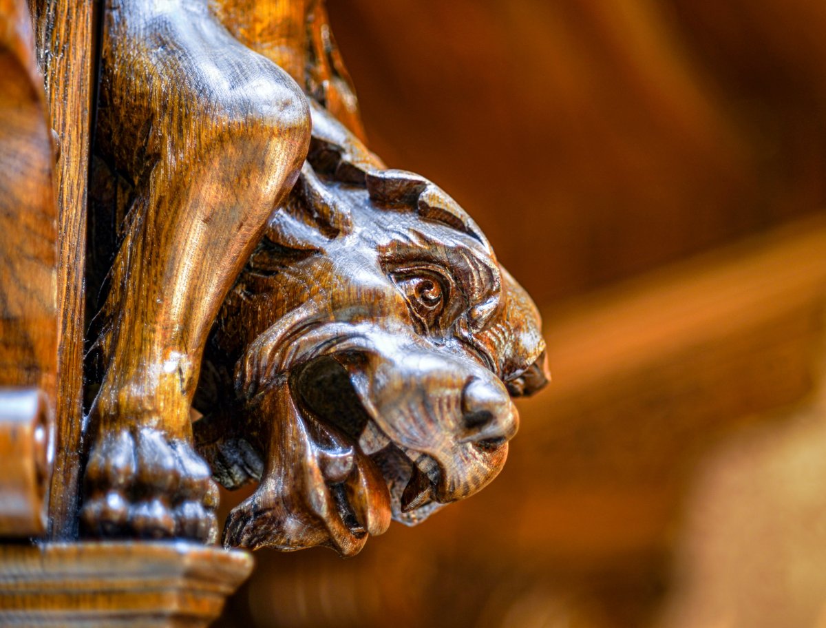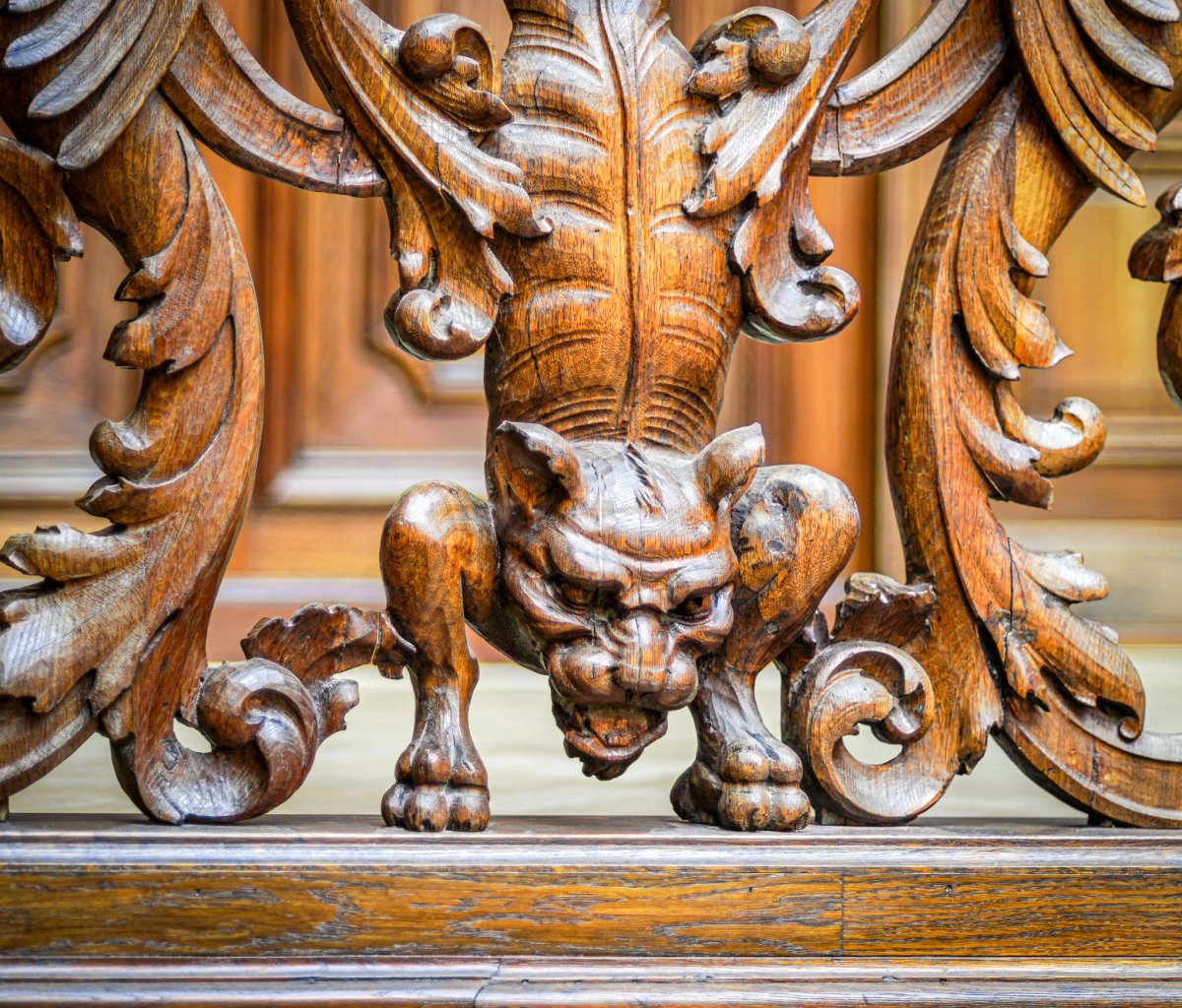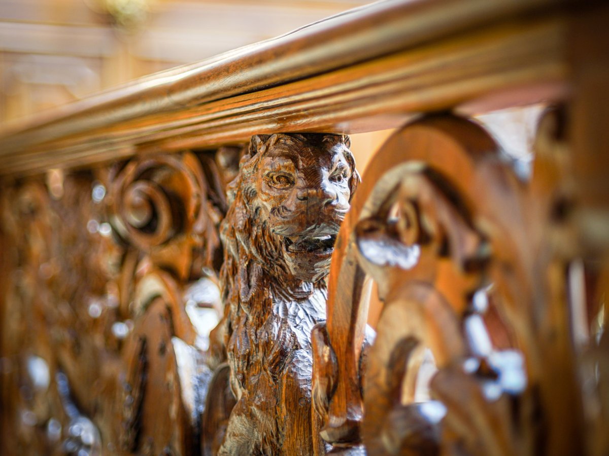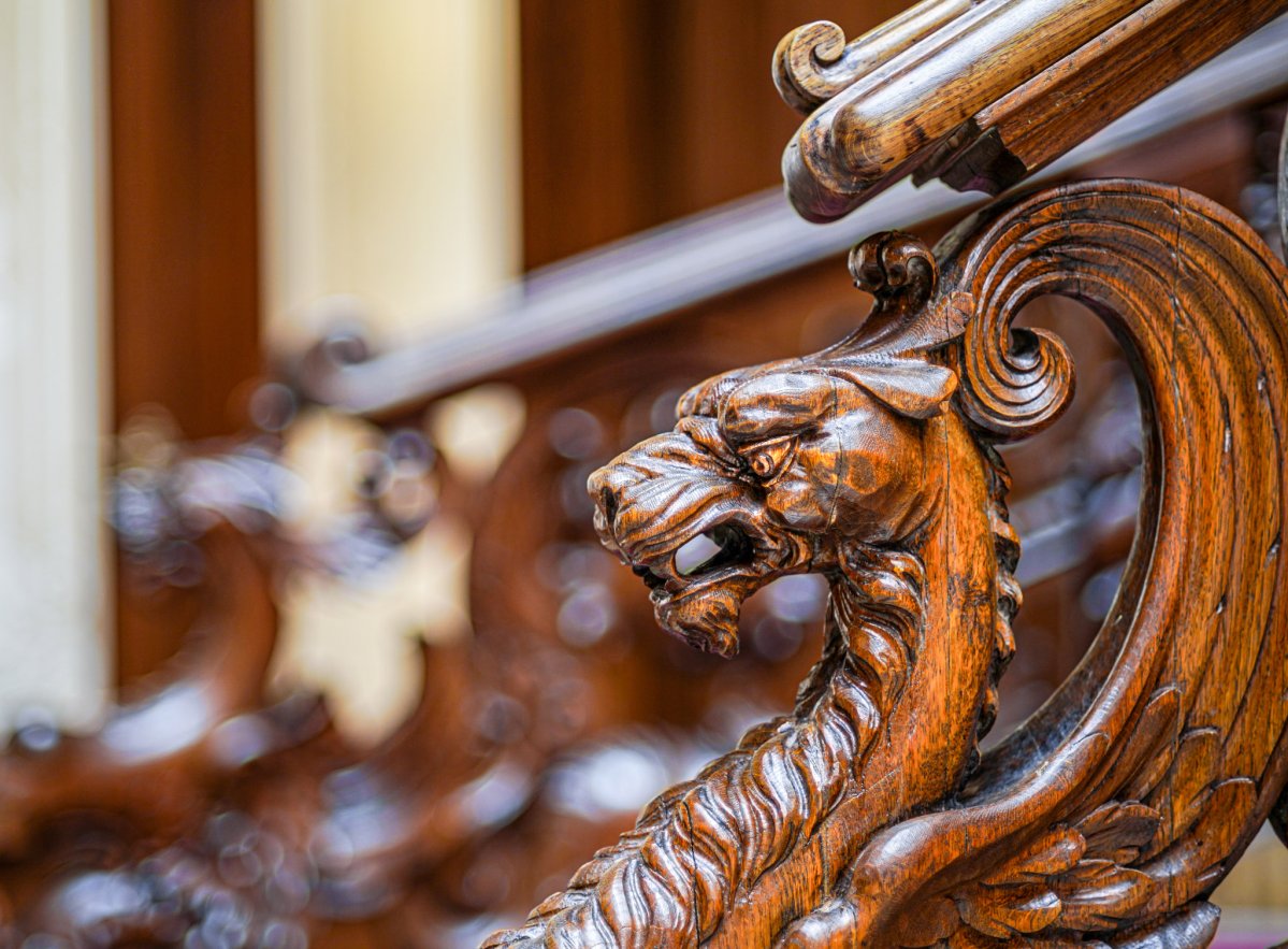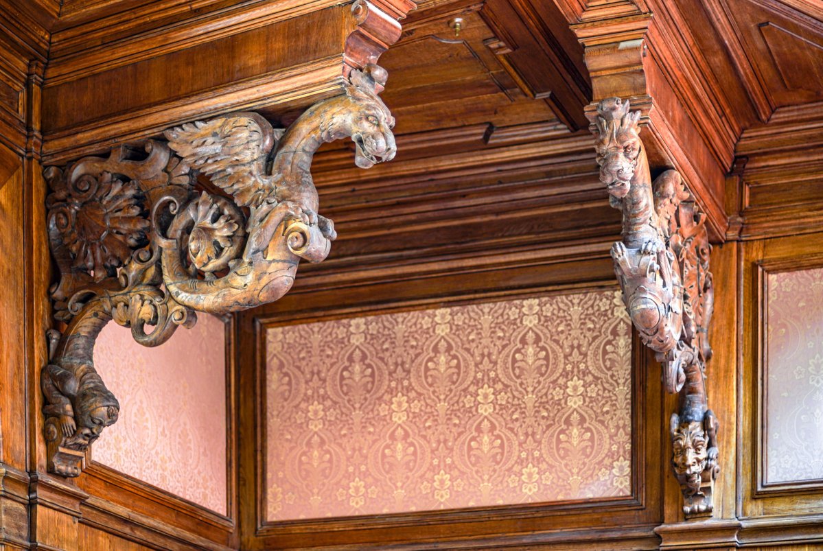 A hall faragott tölgyfa enteriőrje főként a híres bútorgyáros, Thék Endre asztalosműhelyének munkáját dicsérte, akinek egy varázslatos, olykor kissé bizarr, mitikus, középkori hangulatot árasztó épületbelsőt sikerült itt kialakítania. A belső tér díszítményei között pazar ügyességgel megformált, a Károlyi és a Csekonics család címereit is díszítő, a rezgő fény játékától olykor megelevenedő, tekergő sárkánykígyók, griffeket és oroszlánokat mintázó állati ábrázolások láthatóak.