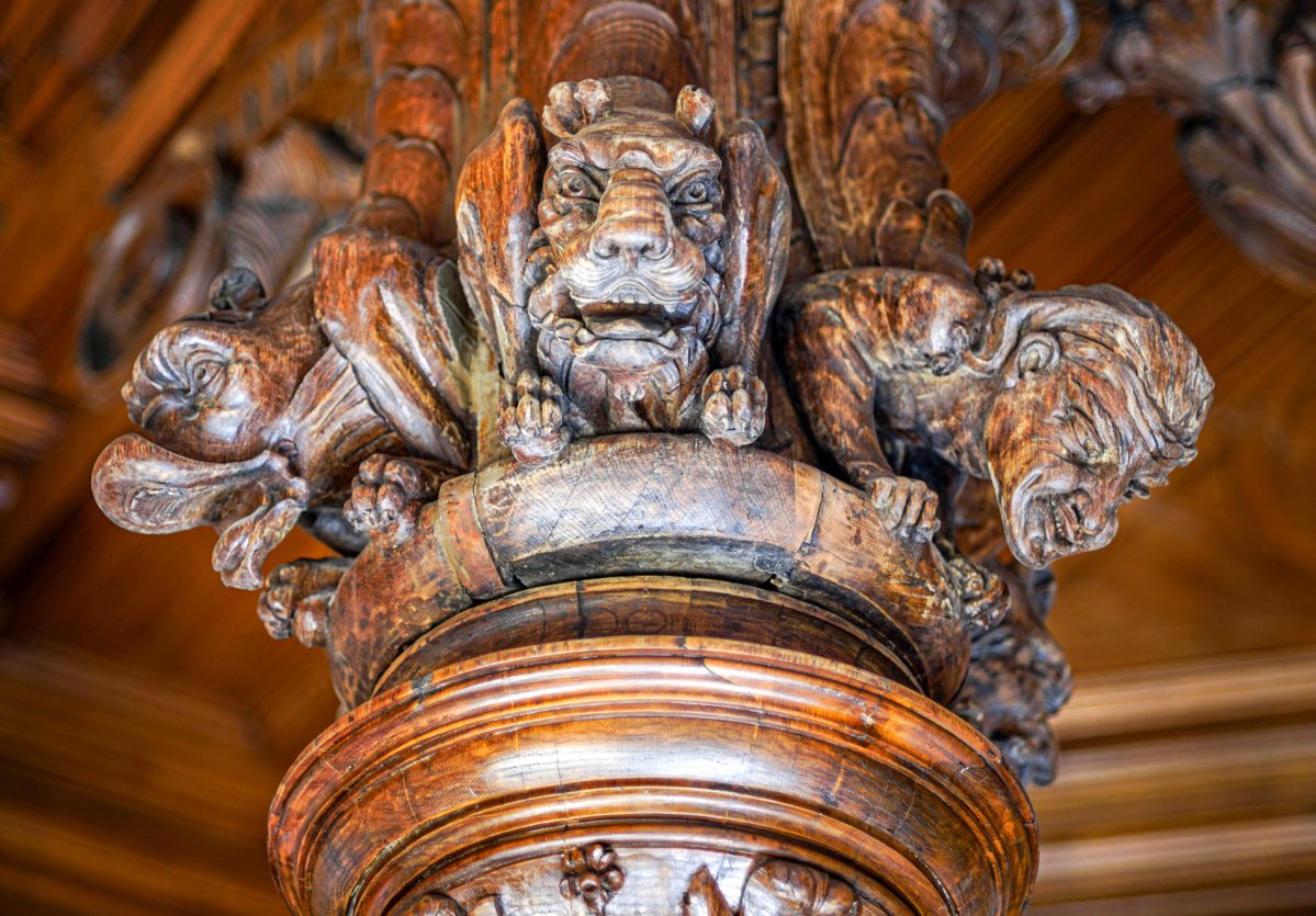A hall középkorias hatását keltik azok a galériát tartó faoszlopok oszlopfejezetei is, melyek olykor szörnyeket mintáznak, másszor pedig szimbolikus és allegorikus figurális faragványokat növényi és geometriai motívumokkal ötvöznek. S ha ez nem volna elég, mindezt fokozták nappal a tetőn keresztül beáramló, este a falikarok által táplált fény és az enteriőr keltette árnyékok, valamint a homályban maradó részek, illetve szürkés tónusok és sejtelmes hangulatfények érdekes játékai. „Ez a Hall néha víg, jókedvű, kedves, máskor mogorva, kiállhatatlan” – mondta egyszer róla Csekonics Margit. S mondhatjuk mi is, hogy a Károlyi-Csekonics rezidencia eme központi helyiségében stílusosan és művészi módon ötvöződik egymással a látvány és az egyediség, a főnemesi pompakifejtés és a kényelem.