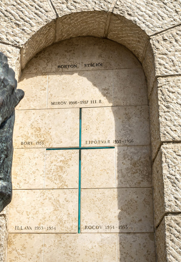 Behind the statue stands a carved block of stone, symbolising a walled prison window, but the arch encircles a thin transparent glass cross, next to which the sites of his suffering are listed.