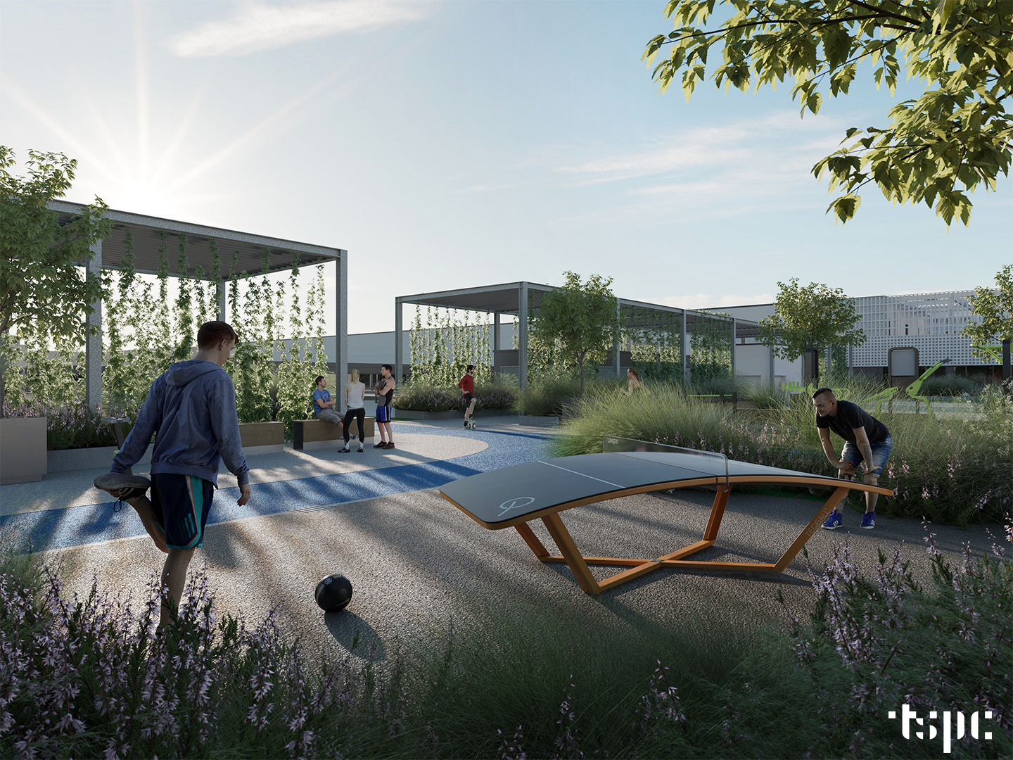 A running track, an outdoor workout park, a small garden and a café terrace on the roof (Source: tspc.hu)