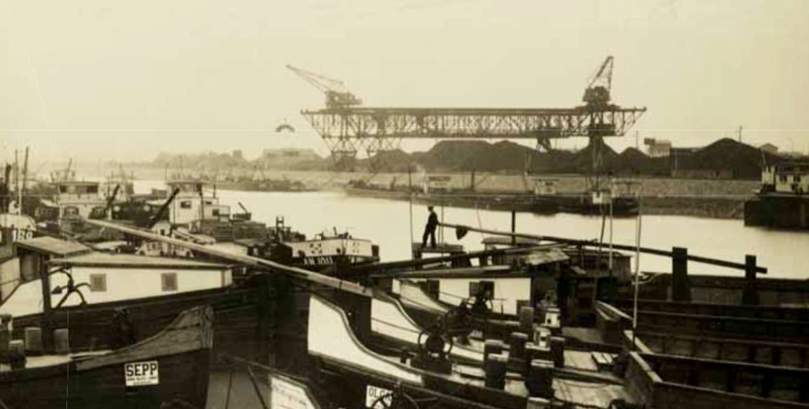 Crane lifts logs out of a barge in 1955, excerpt from the book (Photo: szabadkikoto.hu)