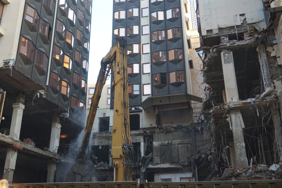 The Fontana Building – also known as the Belvárosi Shopping Centre, Fontana Fashion House, and the Aranypók-Konzumex Clothing Store – on 26 February 2021. Heavy machinery moved in to carry out the demolition (Photo: pestbuda.hu)