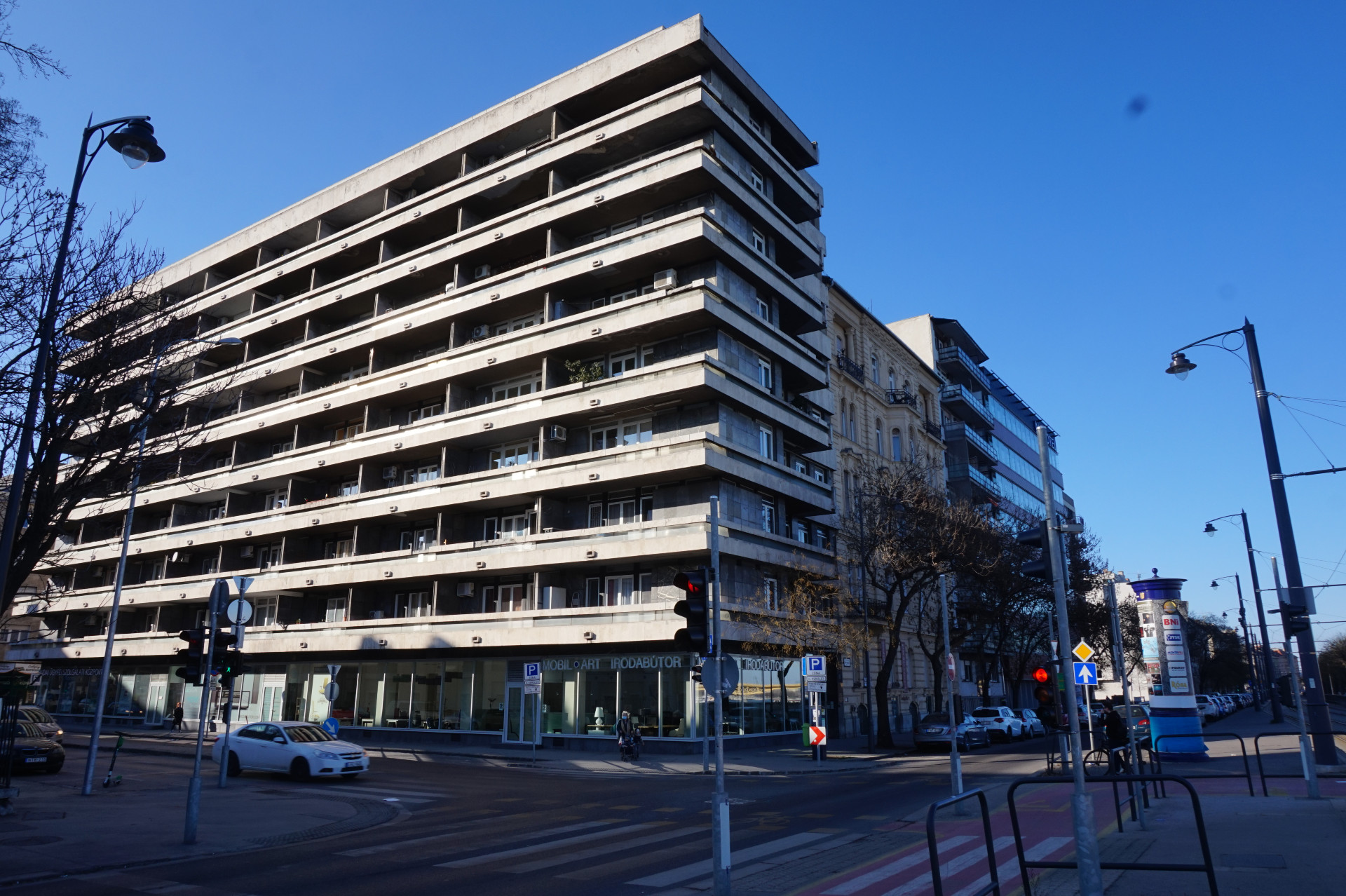 The building opened in 1984 and was criticised immediately. The building's geometrical facade and protruding windows created a monumental appearance that stood out from its surroundings. (Photo: pestbuda.hu)