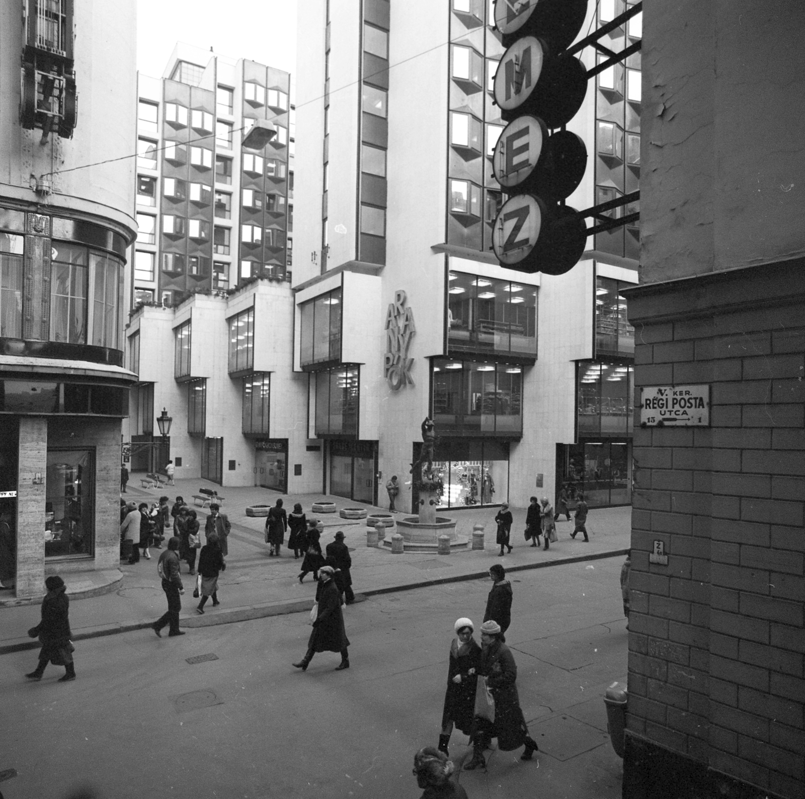 The intersection of Régi Posta Street and Váci Street in 1983, in the centre, the Fontana Department Store, in front of the Hermész Fountain (Photo: Fortepan/No.: 67096)