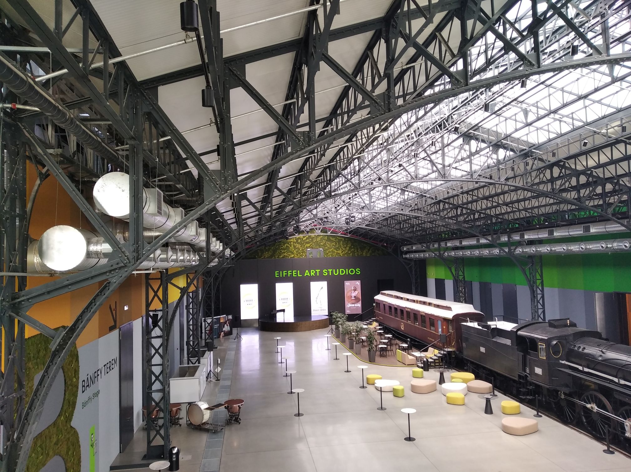 The front third of the building can be visited by the public. In the middle of this is a huge communal space, in which a MÁV 327 locomotive and an adjoining dining car refer to the earlier life of the hall. It can comfortably accommodate museum vehicles - especially the height of the hall is breathtaking, which has also allowed a hanging corridor to be stretched across the hall. This connects the galleries on both sides, from which the auditorium entrance of the lecture halls opens: on the left is the Miklós Bánffy lecture hall, and on the right is the sound control named after Ferenc Fricsay. In the galleries, visitors can see exhibitions related to acting and the history of the building, the latter theme being presented in the material of the Museum of Transport.