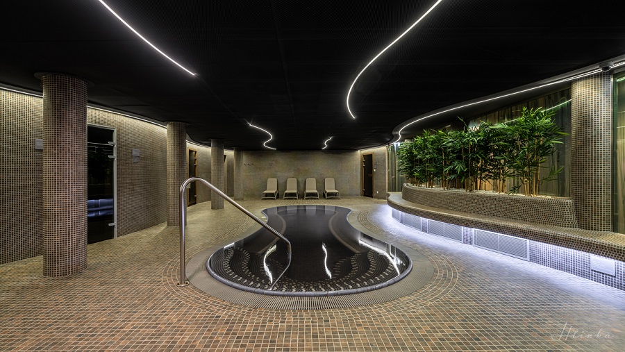 The specialty of the design was given by the fact that Vadász street is very narrow and its width barely exceeds 9 meters. In order to make the best use of the disadvantages, the natural light reaches the subterranean levels thanks to the metal-glass structure stretched in front of the real façade. Keeping in mind the energy efficiency aspects, a thermal well more than 800 meters deep was drilled in V.30, and the thermal water obtained in this way is also suitable for heating the building and heating the pool water. The multi-storey complex has also counterbalanced the small floor space with practical architectural solutions, such as a swimming pool suspended above the swimming pool or a terrace with a sports hall, as well as movable walls in the function rooms.